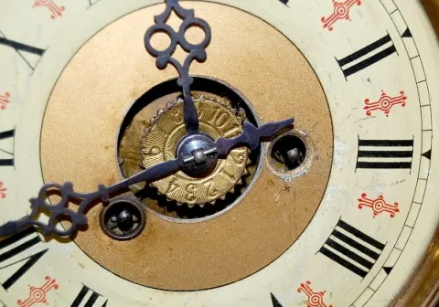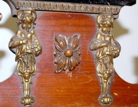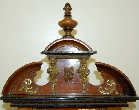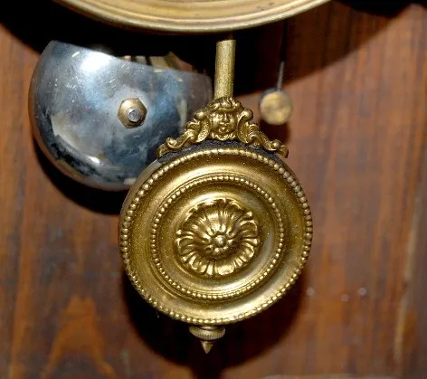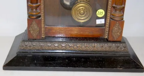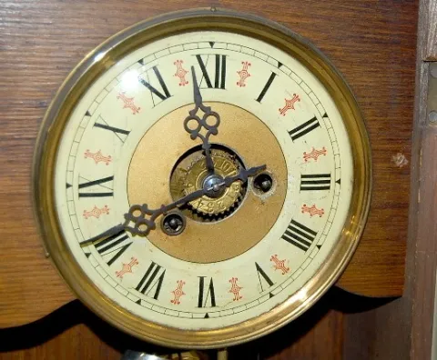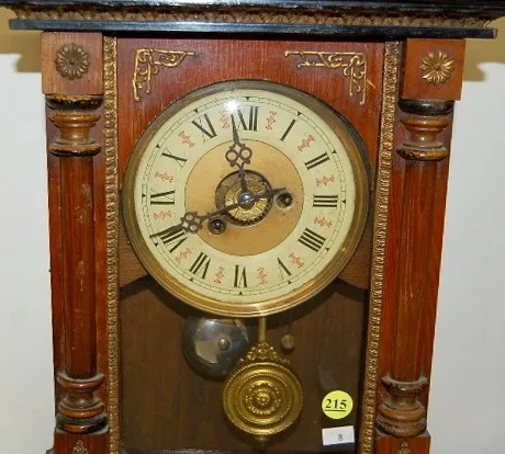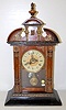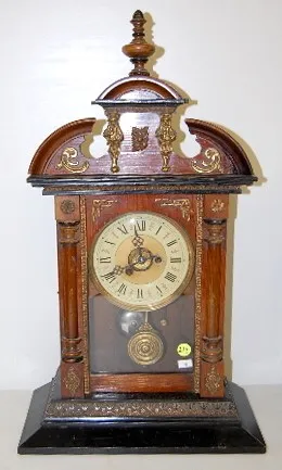 time, strike and alarm; 5 1/4" painted tin dial with Roman numeral; has key and pendulum; plain door; metal mounted and pressed case; not tested for r...