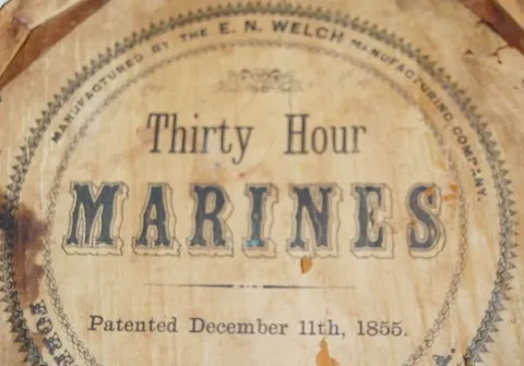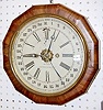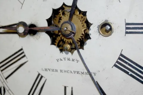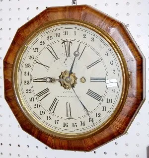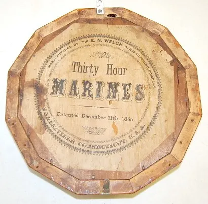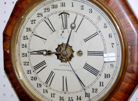 time, strike and alarm; 9 1/2" painted tin dial with Roman numerals, days and seconds bit; marked "Patent Lever Escapement"; nice label on the back; v...