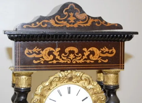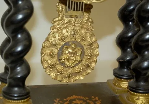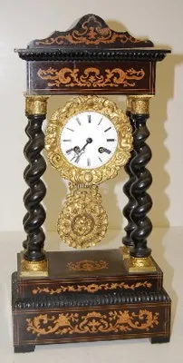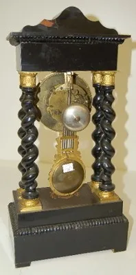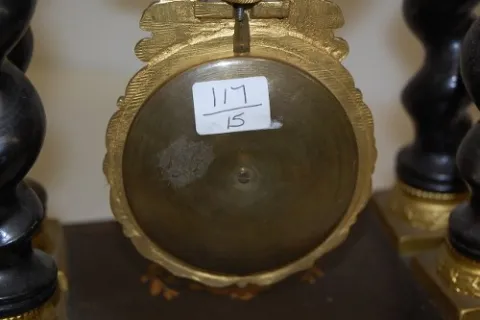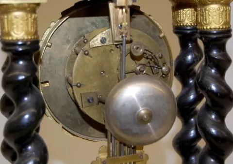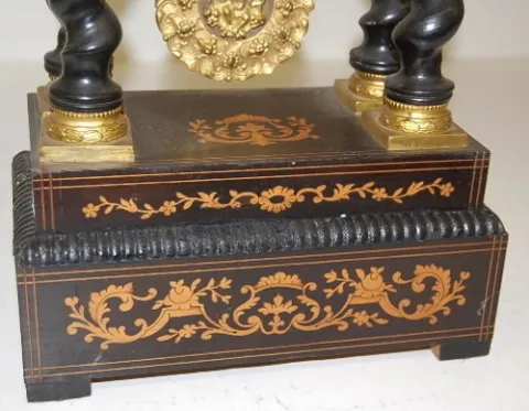 porcelain dial; ornate bezel and pendulum; bell strike movement. (Dial has hairlines; case has roughness and some restoration.) 20"...