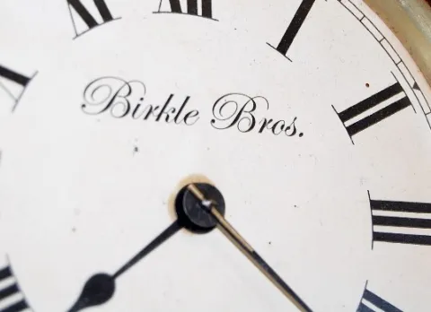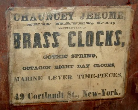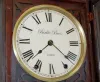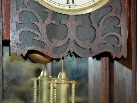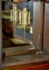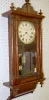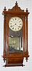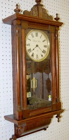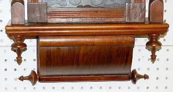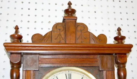 brass trim and pendulum; mirror back; scroll, carvings and finials; time and strike. 36"...