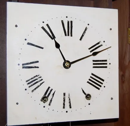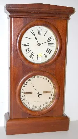 double dial; 8 day time; spring strike; unmarked dials; metal dial is 8 1/4"; paper dial is 8 1/2"; has pendulum; rosewood and walnut case; label insi...