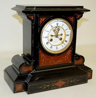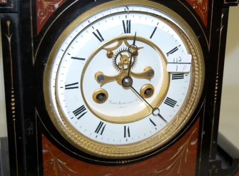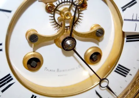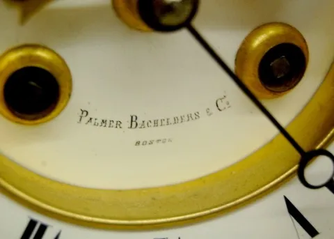 8 day time and bell strike; 4 3/4" double sunk dial, marked "Palmer Bachelders and Co., Boston"; with visible escapement; beveled glass front and back...