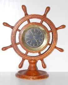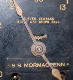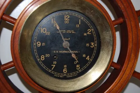 in wood ship's wheel frame; 11 J; 8 Day; black dial; screw bezel; S.S. Mormacpenn on the dial. 20" x 18" x 7 1/4" clock (Rough wood finish.) This lot ...