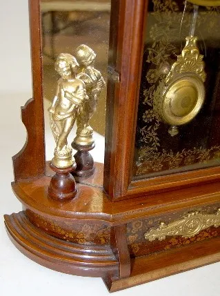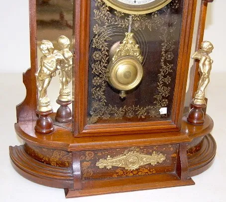 8 day time and strike; 5 1/4" painted tin dial; has key and pendulum; gilt figures; gold floral decorated glass door. (Paint loss to dial; mirror show...