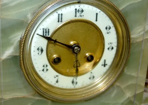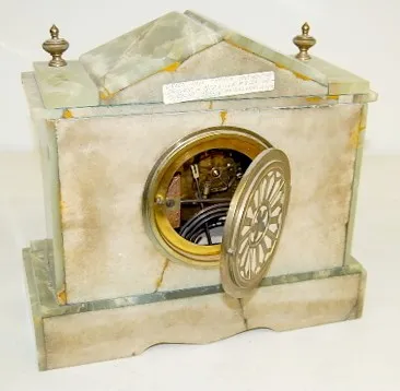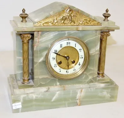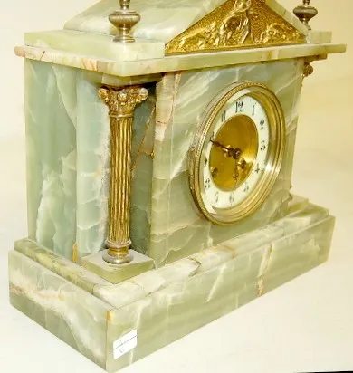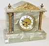 time and strike; hour and half hour strike: green onyx case with cast metal trim and columns; 3 3/4" porcelain chapter ring dial with Arabic numerals;...