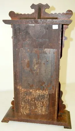 8 day time and strike with alarm; 5" marked paper dial on tin; has pendulum; no key; painted door; not tested for running condition. (Dials crazed wit...