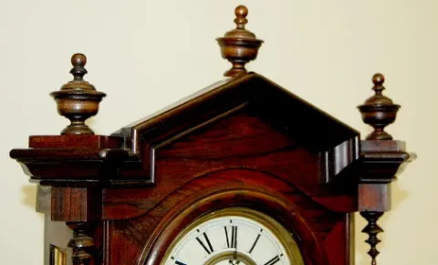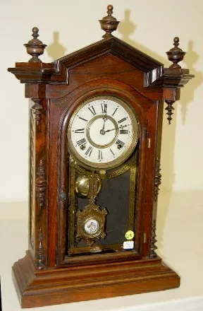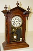 8 day time and hour and half hour strike; 5" unmarked painted tin dial with Roman numerals; pendulum with glass insert; has key; gold decorated door; ...