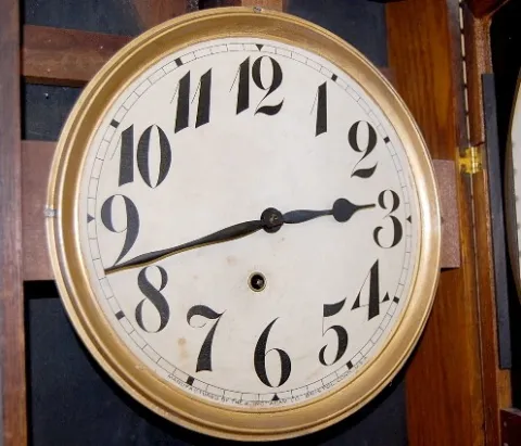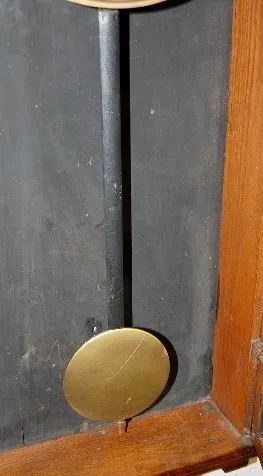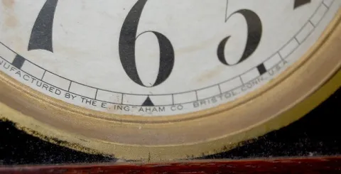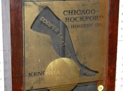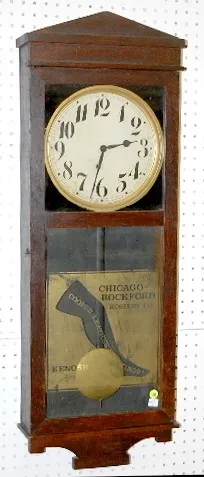 oak case; brass trim and pendulum; 9 1/4" paper dial; time only; glass reads "Cooper Leather Stockings Chicago-Rockford Hosiery Company Kenosha Wiscon...