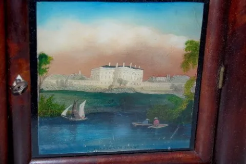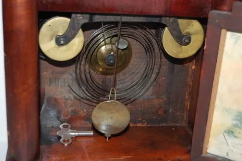 nice tablet; w/ key and pendulum; partial label. 19" (Case has minor roughness.)...