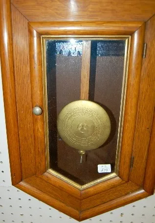 oak case; brass trim and pendulum; time only. (Some restoration to dial.) 31"...