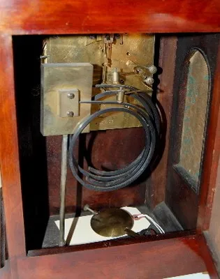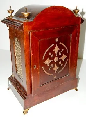 unmarked metal dial; Arabic numerals; time and 2 gong strike; beveled glass; inlaid urn decoration; open sides for chimes; movement marked 56 Lenzkirc...