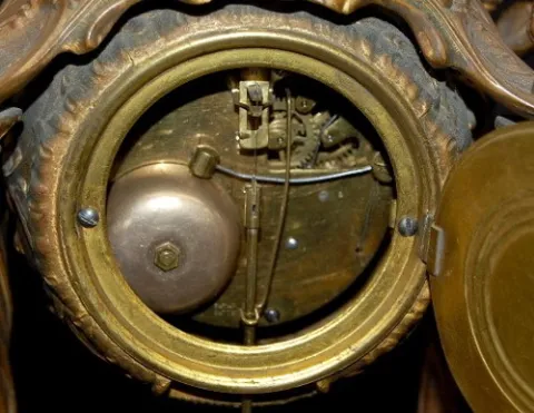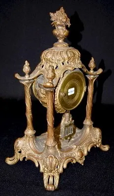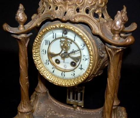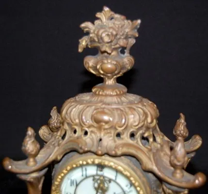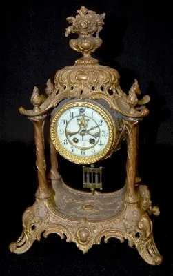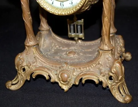 marked Gilbert double sunk porcelain dial; Arabic numerals; visible escapement; all metal case; movement marked Gilbert Clock Co. pat. 1896, 1902; has...