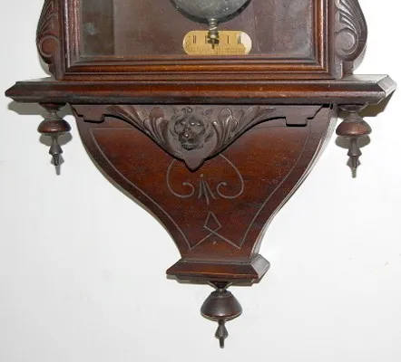 , Hanging Regulator: signed dial; carved case w/wood and metal lion heads; nickel trim; T and S. 36"...