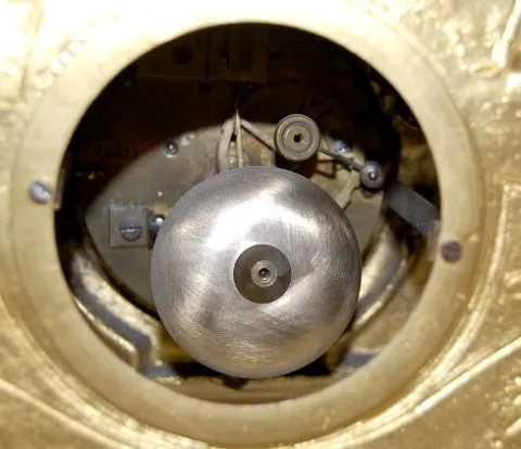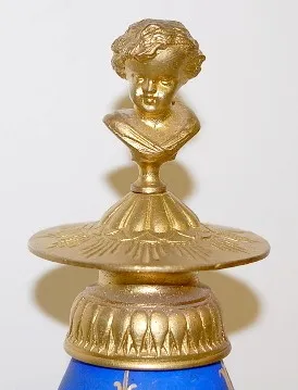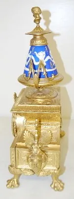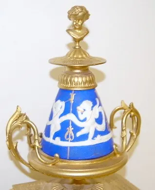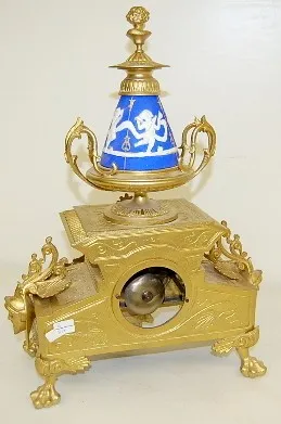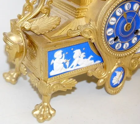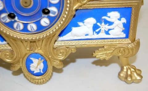 time and strike; 3 1/8" dial; Dore case with cherub head, Viking faces and paw feet; porcelain blue and white panels decorated with winged cherubs at ...