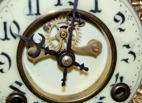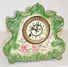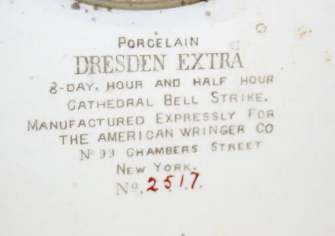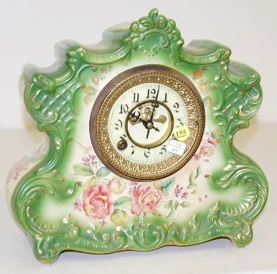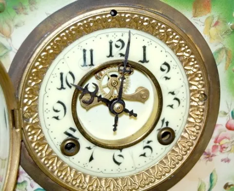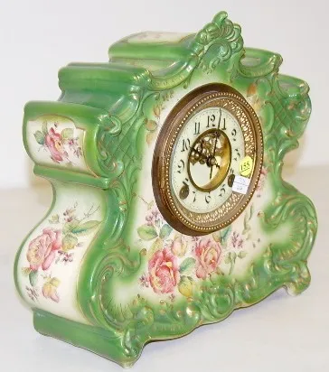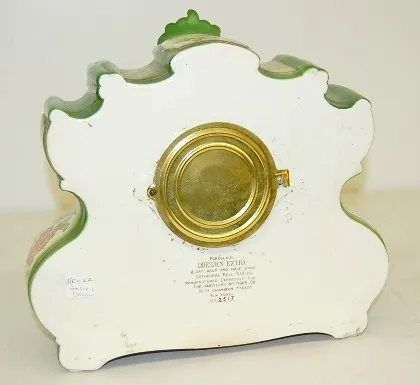 time and strike with hour and half hour cathedral bell strike; decorated double sunk porcelain dial with visible escapement; no key or pendulum; rose ...