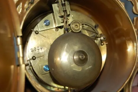 T and S; porcelain dial; Japy Freres bell striking movement numbered 2906J; serpent and floral case. 15"...