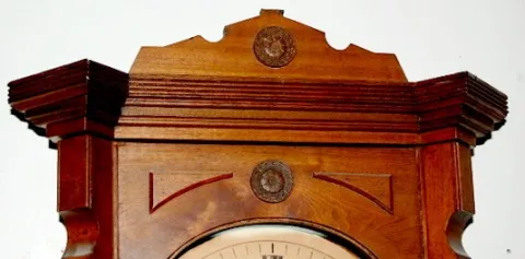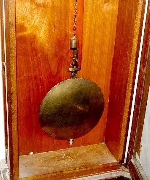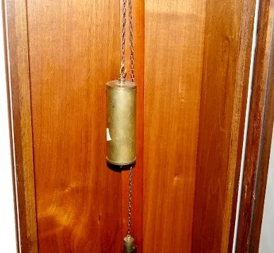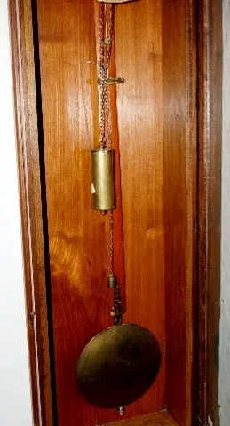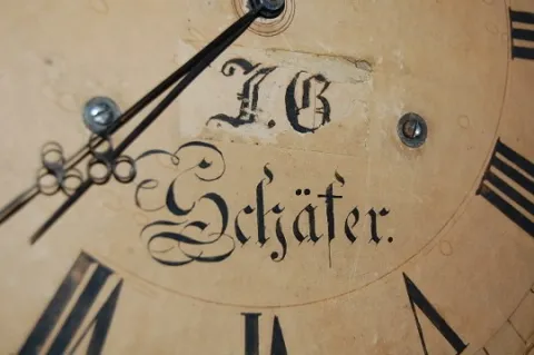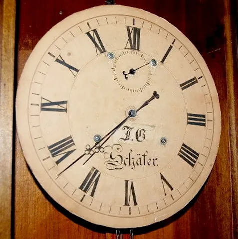 brass weight and pendulum; w/ seconds bit; movement is stamped Johan Gotlib Schafer K.R. Sagsen; back of dial reads "Rcv'd from Ray Shafer's son in 19...