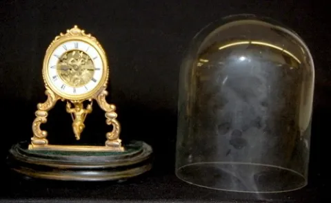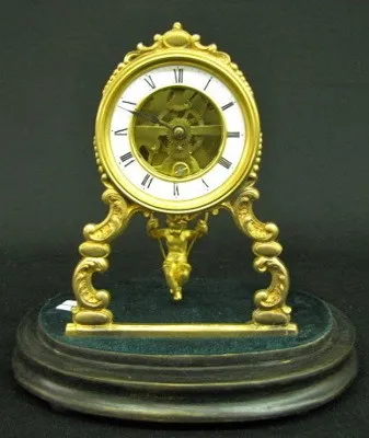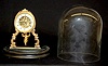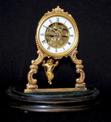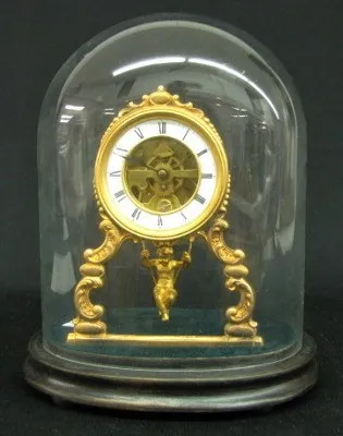 French To and Fro Dome Clock W/ Cherub: porcelain dial; visible movement; antique glass dome on wood base. Dome is 11 1/4" on 9" oval base....