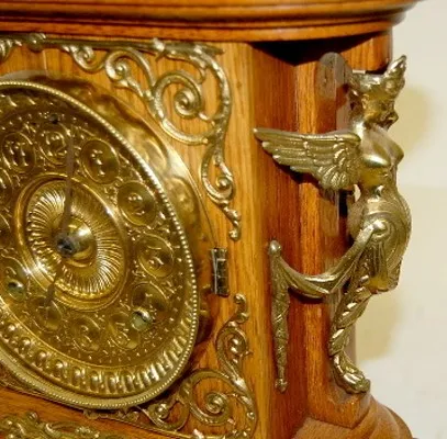 full bodied winged ladies; paw feet; fancy trim and dial; signed. 18"...