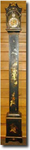 British mini longcase clock c1920s Elegant mini longcase in blue chinoiserie case, 60 inches high. Timepiece platform movement. British c1920s