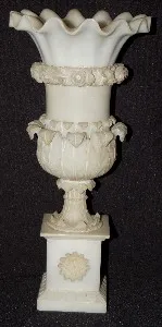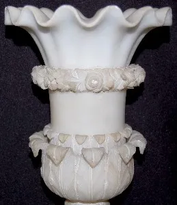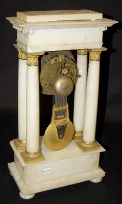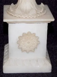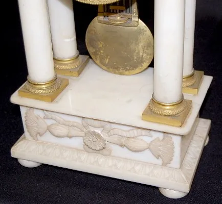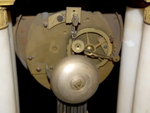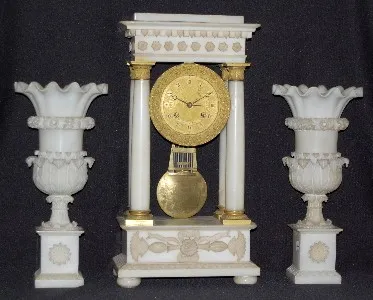 marble and bronze; bell strike movement; signed Hache and Donai. (Side vases have some damage; flower has been repaired on the clock.) 18 1/2"...