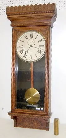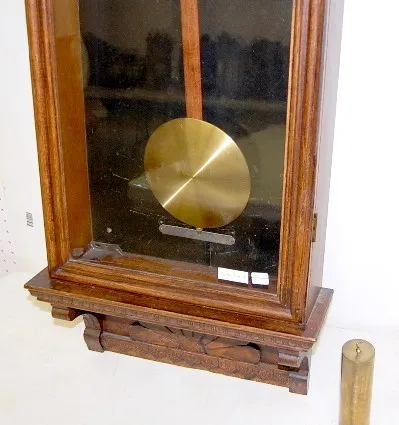 1 weight; 11" marked paper dial with seconds bit and nickel trim; has pendulum and weight; not tested for running condition. (Dial discolored; has a n...