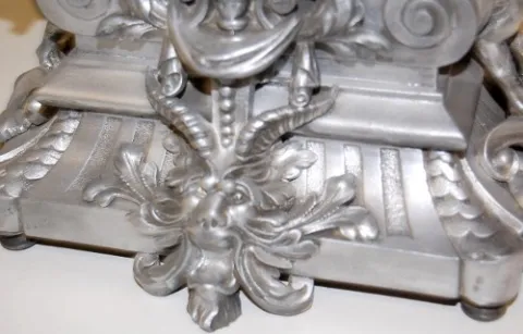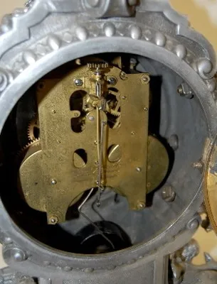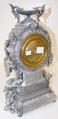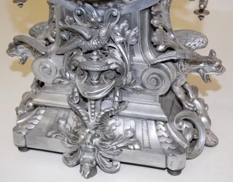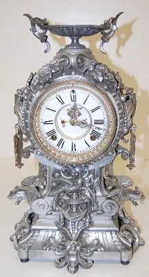 Ansonia "Franconia" Clock W/ Griffins and Mephistopheles: porcelain dial, open escapement, iron case; winged griffins and bird. (Patina has been resto...