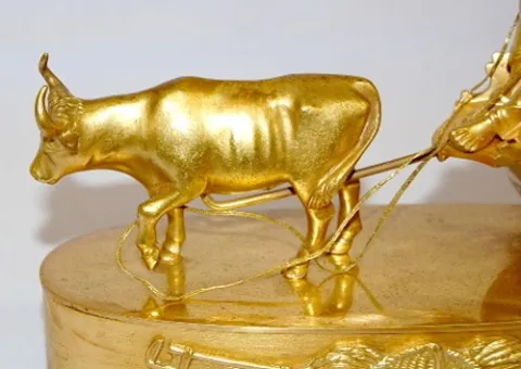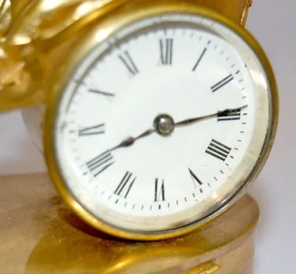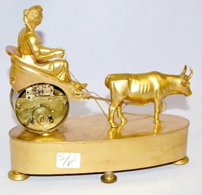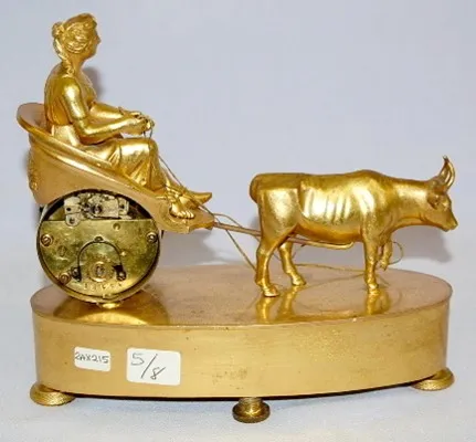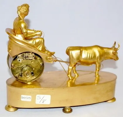 key wind movement; dore figural case of an oxen pulling a lady in a cart; porcelain dial with Roman numerals; beveled glass; no key. (Back cover is mi...