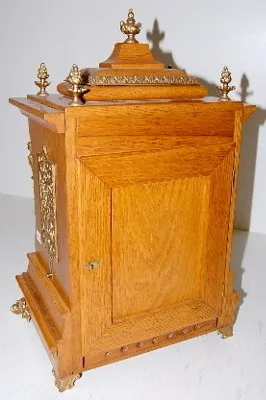 Oak case w/ ornate trim; T and S w/ Wilcock movement; good inside label. 18 1/2"...