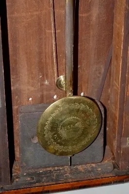 weight driven; brass embossed Seth Thomas pendulum; gold gilt lower glass; w/ seconds bit. (Wood bezel has veneer repairs and minor chips.) 34"...