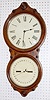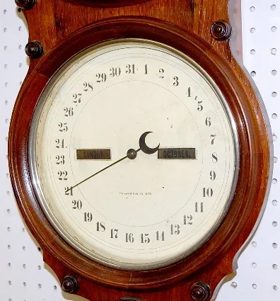 hanging double dial; time strike and calendar; nickel trim. (Lower dial has some roughness and paint touch up.) 32"...