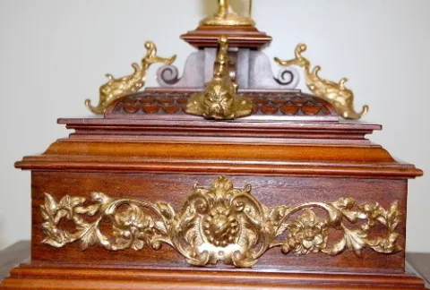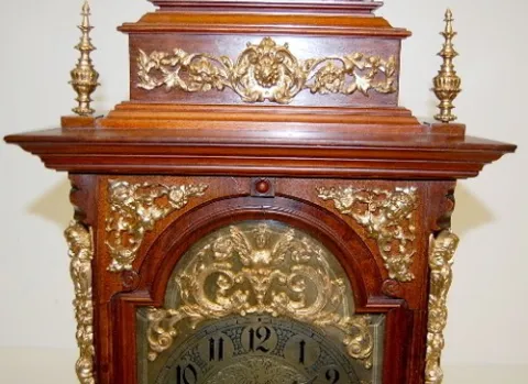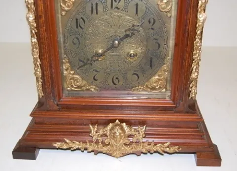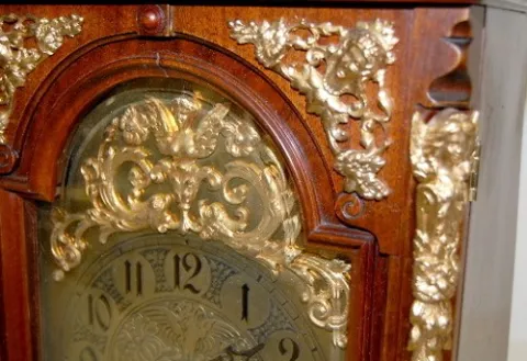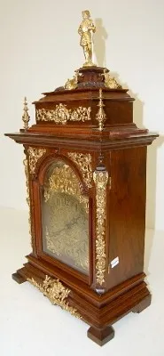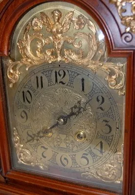 walnut case; ornate bronze winged angels; lady head; fancy engraved dial; dolphin heads on top by crusader type figural finial. 26 1/2"...