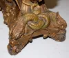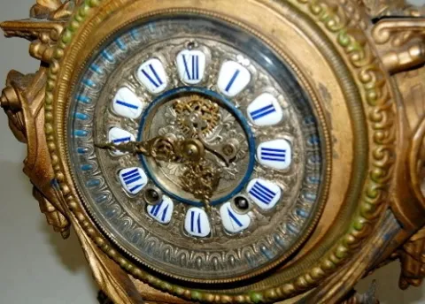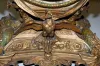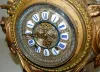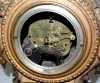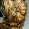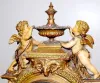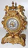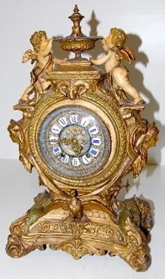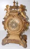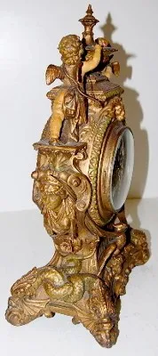 all metal with porcelain cartouche numerals; visible escapement; 8 day; half hour gong strike; beveled glass; cherubs, lady heads, eagle, ram's head a...