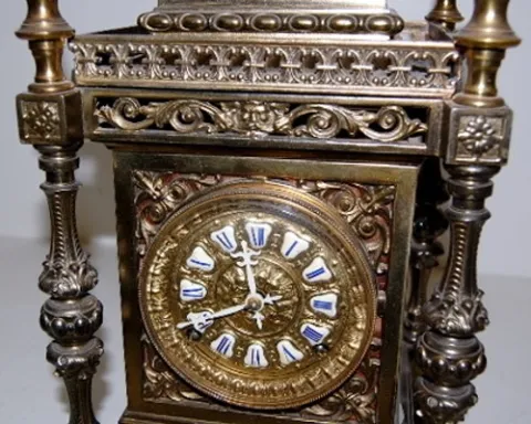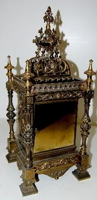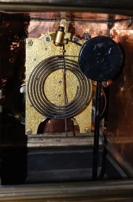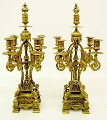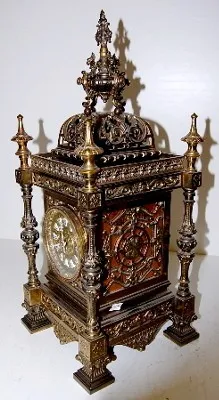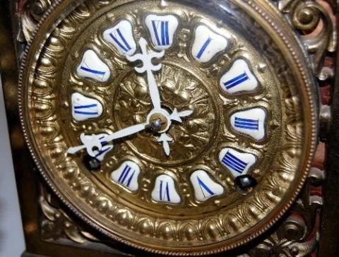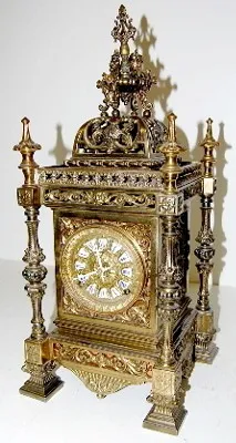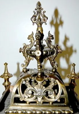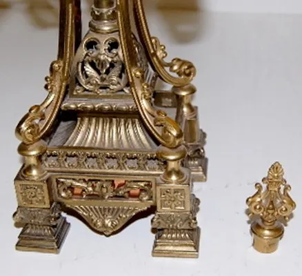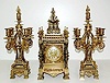 3 piece set; all metal with porcelain Roman numeral cartouche numbers; 8 day time and half hour strike; no key or pendulum; movement marked Ansonia Cl...
