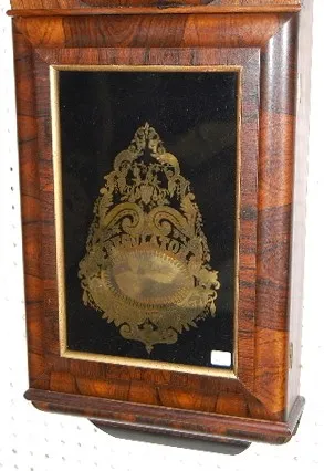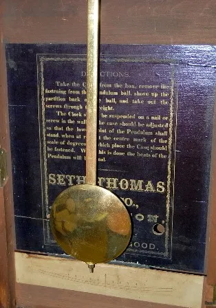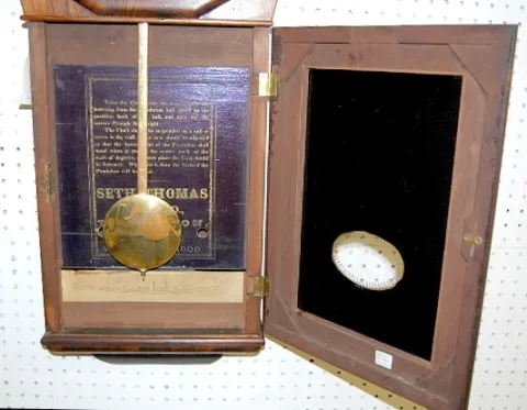 with seconds bit; 13" dial; brass trim and pendulum; weight driven; excellent interior label; nice condition. 41"...