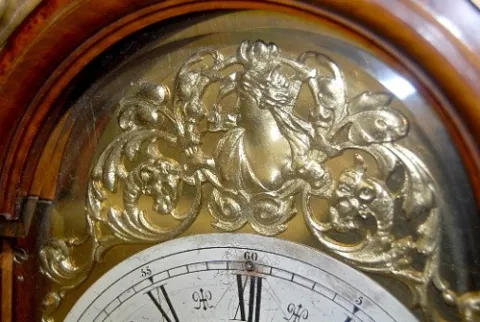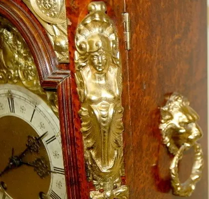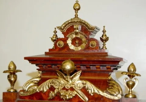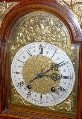 marked movement "Lenzkirch 405401, 55"; has key and pendulum; brass decoration including clock top and finials; lion heads; helmeted winged ladies, he...