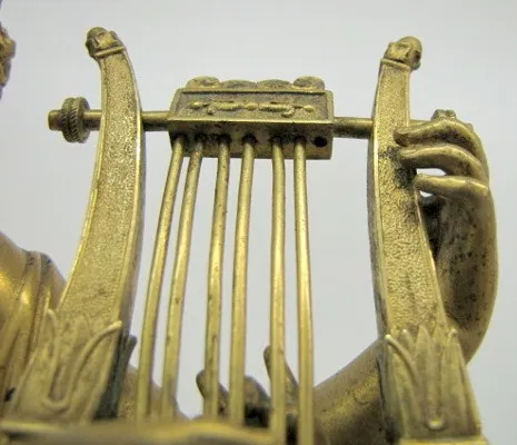porcelain dial marked "a Paris"; unmarked movement; time and strike; has pendulum; lady playing harp with cupid; Roman heads and flame applique on fro...