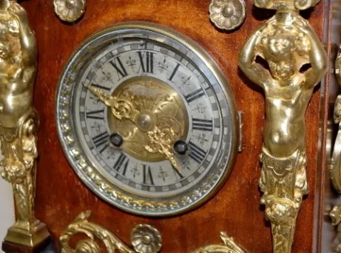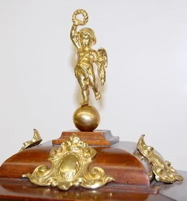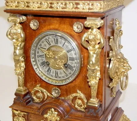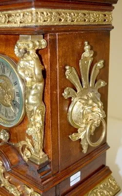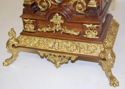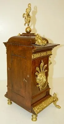 very ornate trim; 3 full sized cherubs; lion legs and side handles; dolphins; silver dial; T and S; signed Lenzkirch No. 540941 22 1/2"...