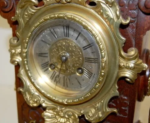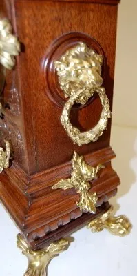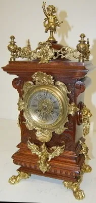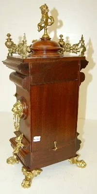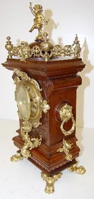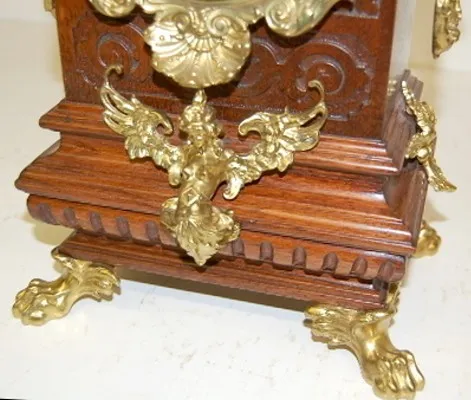 Lenzkirch Serial No. 634905; carved walnut case; cherubs; winged angel; ornate gallery and finials; lion head sides and feet. 21 1/2"...