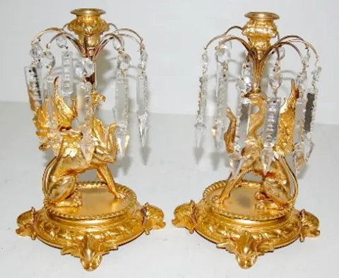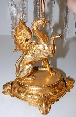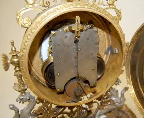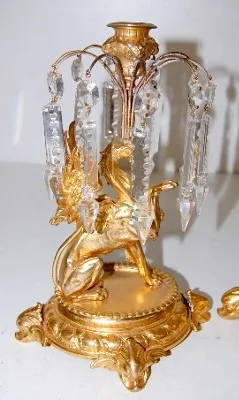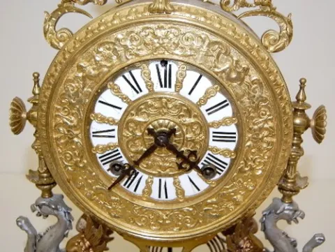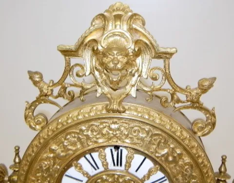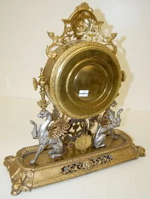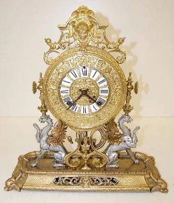 all metal with lion's head, lady heads and figural griffins; dolphin head feet; porcelain dial with Roman numerals; time and strike, gong strike; move...