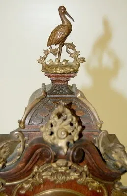 signed 6938; porcelain dial; winged cherubs; ornate trim; stork on nest finial. (Case has a few finish scuffs.) 18"...