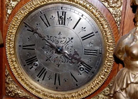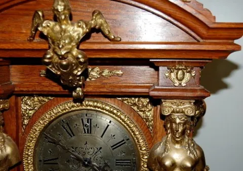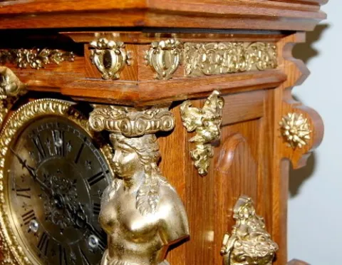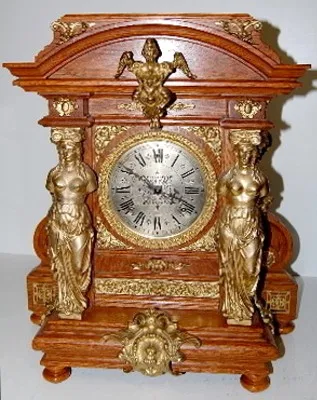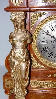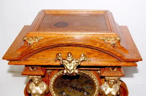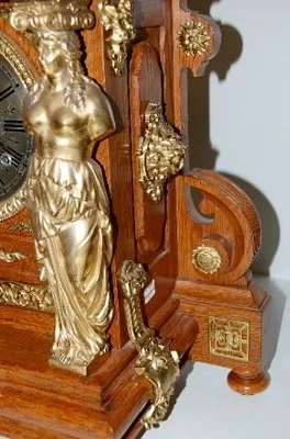 8 day; half hour gong strike; antique oak case with brass trim and 6" silver dial; trimmed with Grecian ladies, winged lady, lady heads and other bras...
