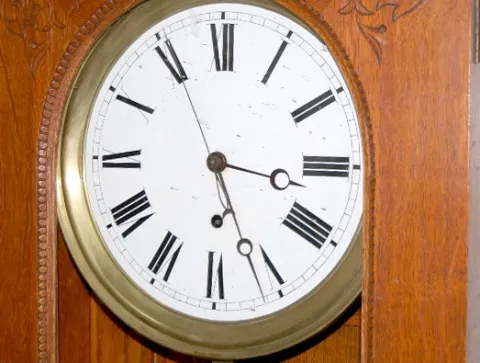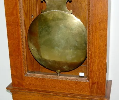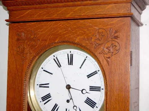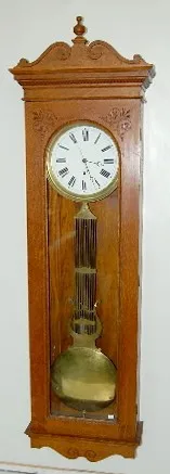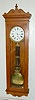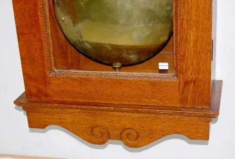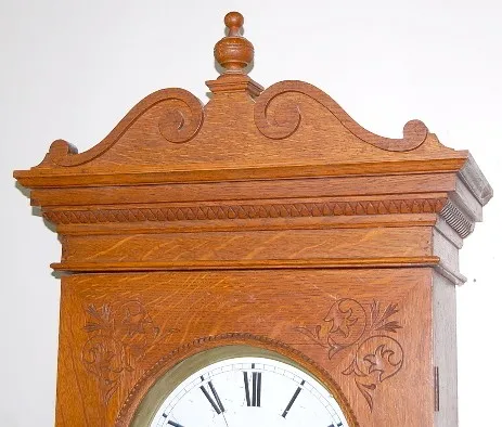 porcelain dial; sweep second hand; nice carved oak case; brass trim and lyre pendulum. 75" x 23"...