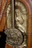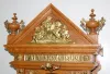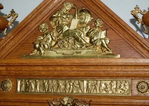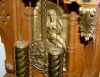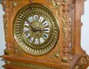 8 day; half hour gong strike; brass decoration including lady and cherubs; has correct pendulum and 2 weights; brass dial with porcelain cartouche num...