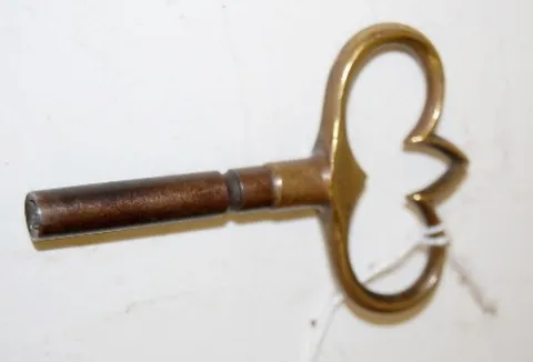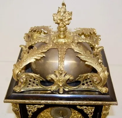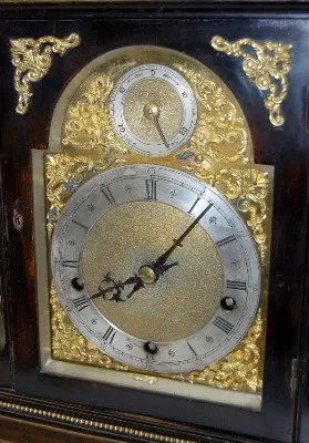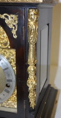 ornate bronze trim w/ faces and floral decoration; heavy torch finial; silvered dial; 4 gong strike; key and pendulum. (Bell has been repaired.)...