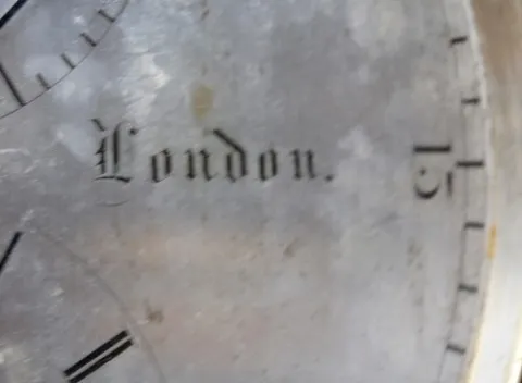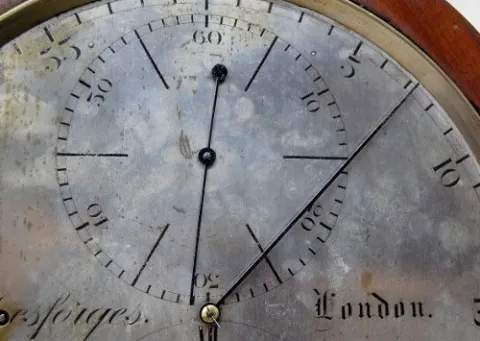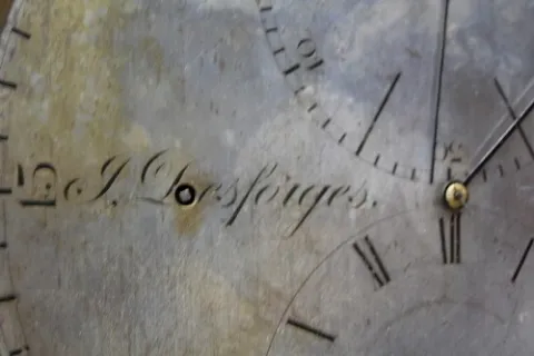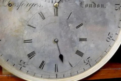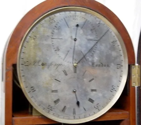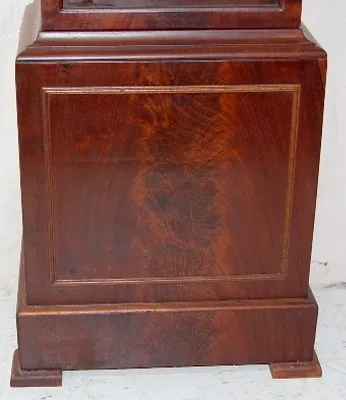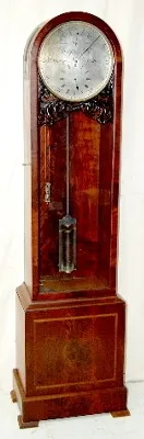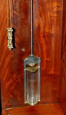 silver metal dial signed T Desforges London; has key, pulley and glass vial pendulum. 72 3/4" x 21" x 12 1/2"...