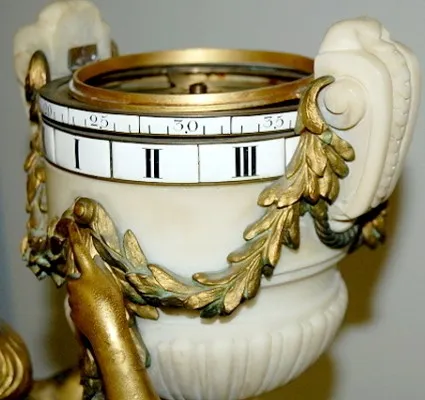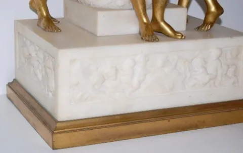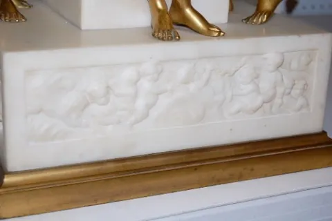 bronze figures and trim; ornate carved marble with cherubs at surrond base; porcelain dial and chapter ring. 30" x 14 1/2" x 10 3/4"...