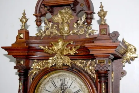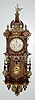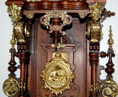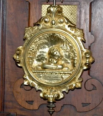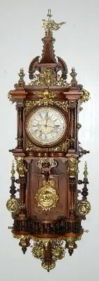 ornate trim w/ masks, elegant lady head; cherub pendulum; mermaid finial; fancy dial; signed Lenzkirch; walnut case. 41"...