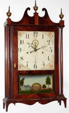 Eli Terry, Plymouth, Conn., 30 hour time and strike model 3 outside escape pillar and scroll shelf clock, c1819
