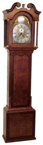 Thomas Wagstaffe, London, 8 day time and strike with calendar composite brass 12" dial tall clock. Wagstaffe was a Quaker who frequently supplied movements to his fellow American Quakers who had them cased in Philadelphia or Newport, movement c1770, case